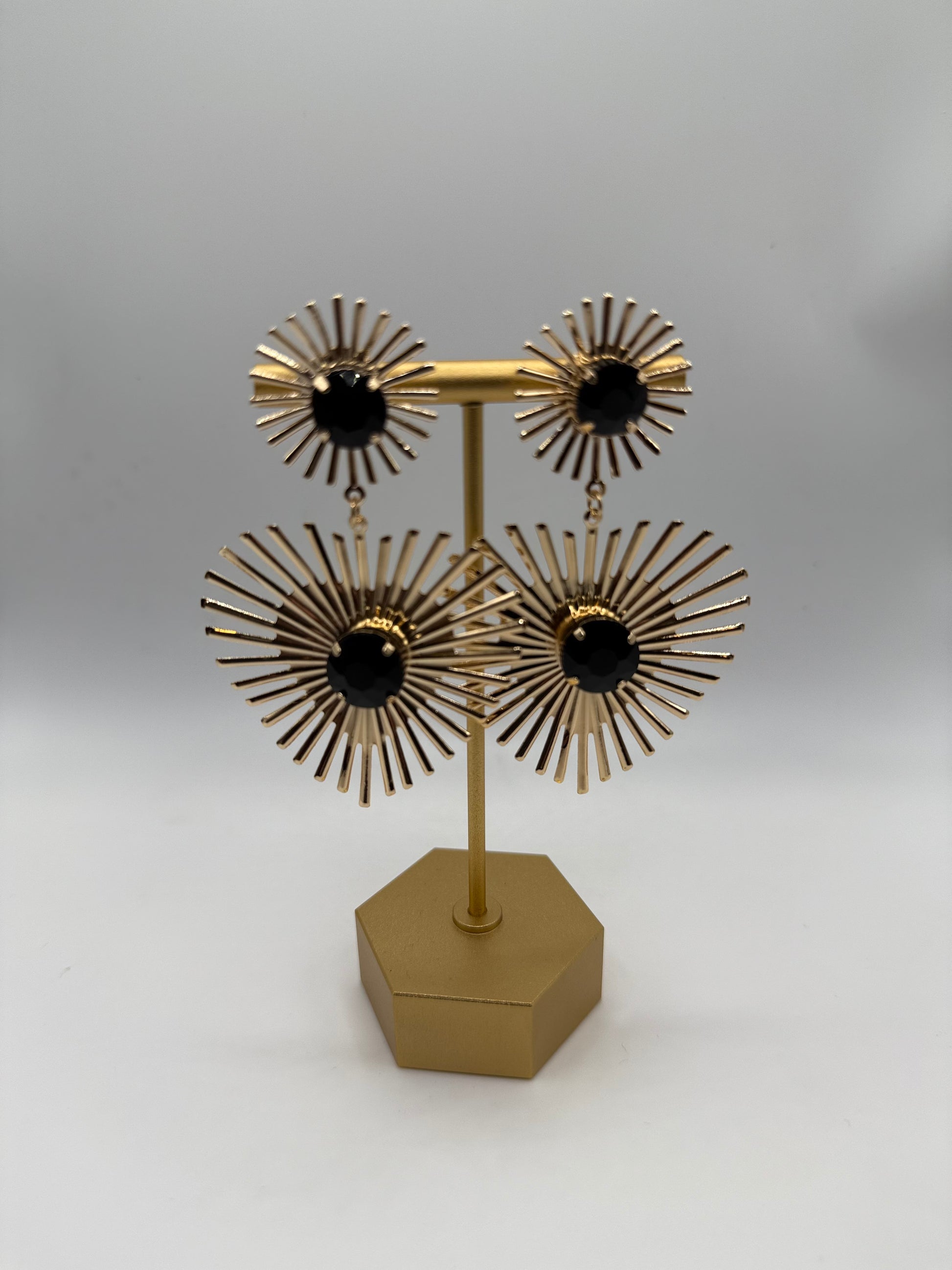 Bold sunburst design with a black center accent for high-impact shine. Lightweight with eye-catching movement that instantly elevates any look.